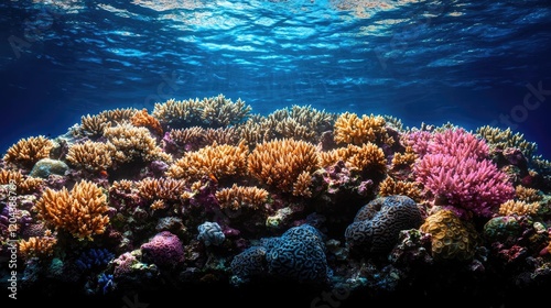 Vibrant coral reef underwater scene, sunlight, ocean background; ideal for marine life documentaries