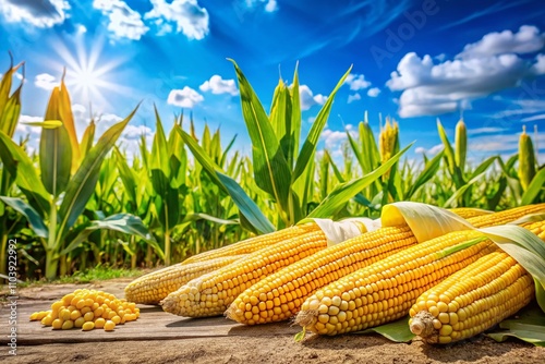 Vibrant Corn Cobs in a Lush Corn Plantation Field Showcasing the Beauty of Agricultural Harvesting in a Sunny Landscape with Clear Blue Skies and Rich Green Foliage