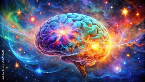 Vibrant cosmic brain with neural galaxy, stars, and nebulae in abstract space art, cosmic, brain, neural, galaxy, stars
