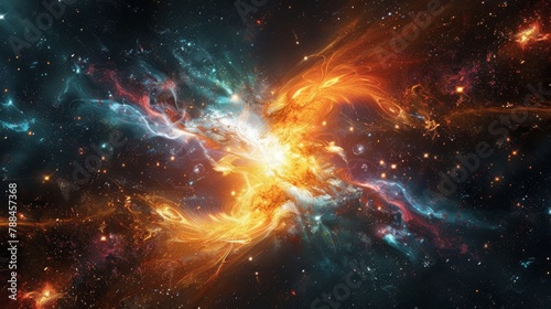Vibrant cosmic explosion with interstellar clouds and celestial bodies in a dynamic nebula composition