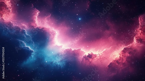 Vibrant cosmic nebula with glowing pink and blue clouds of interstellar gas and numerous bright stars scattered in deep space