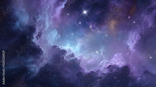 Vibrant cosmic nebula with stars and clouds in shades of purple, blue, and white creating a dreamy and ethereal space scene