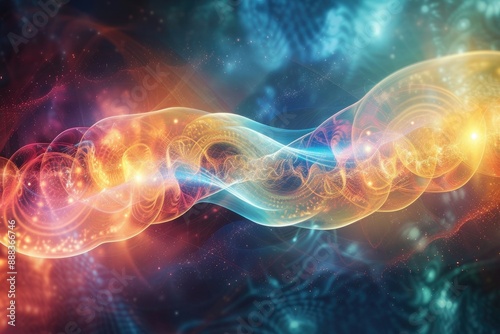 Vibrant cosmic nebulae, glowing ethereal energy, background showcasing the concept of wave-particle duality
