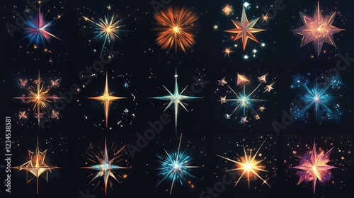 Vibrant Cosmic Star Patterns in Vivid Colors with Different Shapes and Designs Set Against a Dark Galactic Background for Creative Visual Projects