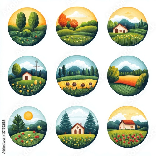 Vibrant countryside landscapes showcasing seasonal changes, charming homes, and lush fields throughout the year
