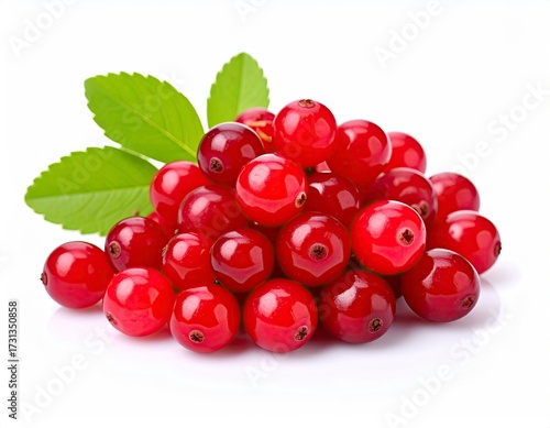 Vibrant Cranberries with Fresh Green Leaves on White Background.