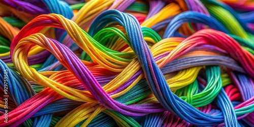 Vibrant, crisscrossing strands of stretchy fibers, resembling colorful elastic bands, weave and overlap in a dynamic, three-dimensional dance under high magnification.