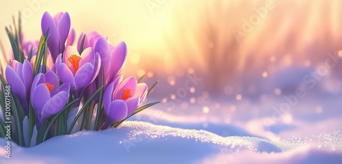 Vibrant crocuses emerging through soft snow in a gentle morning light