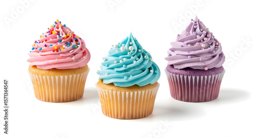 Vibrant cupcake trio with pastel frostings and sprinkles, isolated with shadow
