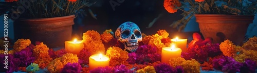 Vibrant Day of the Dead altar with marigold flowers, candles, and a decorative skull, celebrating life and honoring the departed.