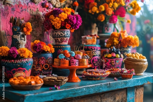 Vibrant day of the dead altar with marigolds sugar skulls and traditional sweets