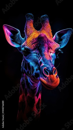 Vibrant depiction of a giraffe showcasing colorful patterns and textures against a dark background