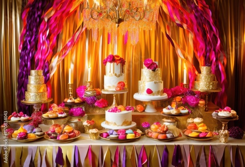 vibrant dessert table display featuring colorful bright treats special celebrations events, cakes, pastries, desserts, sweets, confections, cupcakes