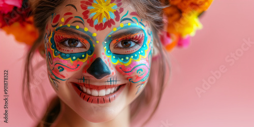 Vibrant Dia de los Muertos Sugar Skull Makeup on Joyful Young Woman