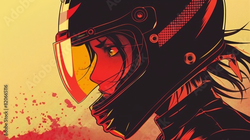 Vibrant digital art of a female motorcyclist with a helmet at sunset.