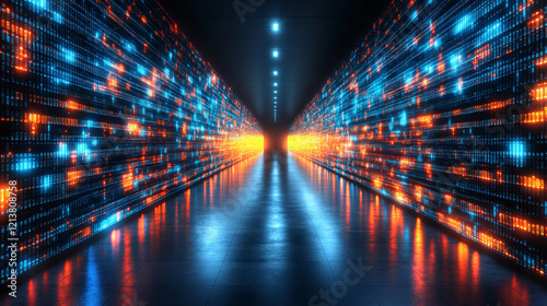 vibrant digital corridor illuminated by blue and orange lights, representing data flow and cybersecurity monitoring. futuristic atmosphere evokes sense of advanced technology and innovation
