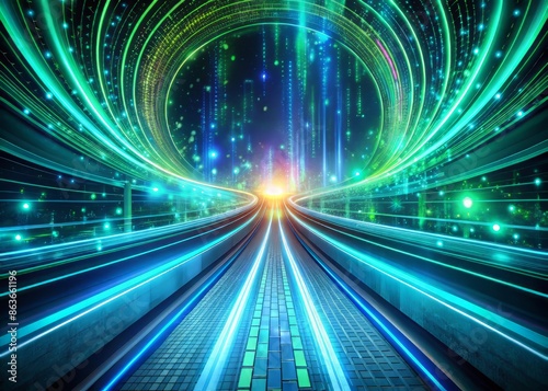 Vibrant digital highway stretches through futuristic cyberspace, illuminated by pulsing neon lights and swirling streams of blue and green binary code.