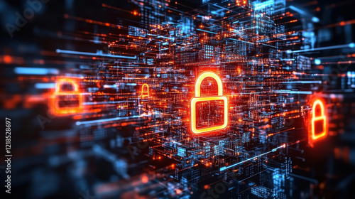 vibrant digital illustration featuring glowing lock symbols amidst network of interconnected data streams, representing cybersecurity and data protection