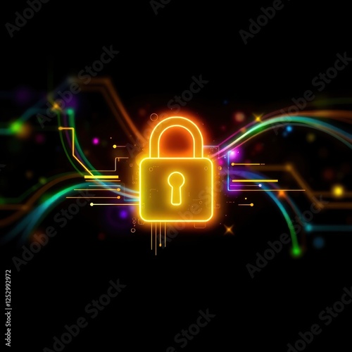 Vibrant digital illustration of a glowing padlock symbolizing cybersecurity amidst colorful data streams