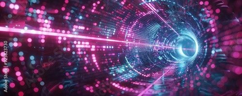 Vibrant digital tunnel with glowing particles and beams of light, creating a futuristic and high-tech atmosphere.