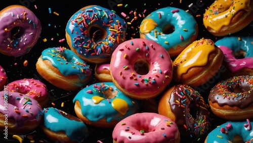Vibrant display of colorful doughnuts with various toppings
