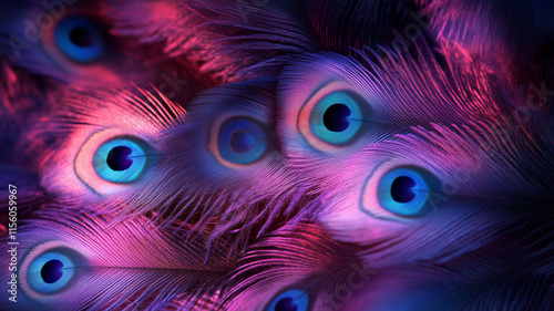 Vibrant display of pink and purple peacock feathers in soft light