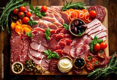 vibrant display sliced meat charcuterie arranged rustic wooden board surrounded fresh herbs garnishes, platter, colorful, feast, appetizer, cuisine, delicious