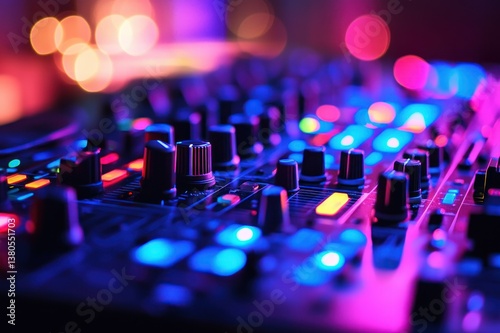 Vibrant DJ Mixer with Colorful Lights and Bokeh Effect for Music and Nightlife Themes