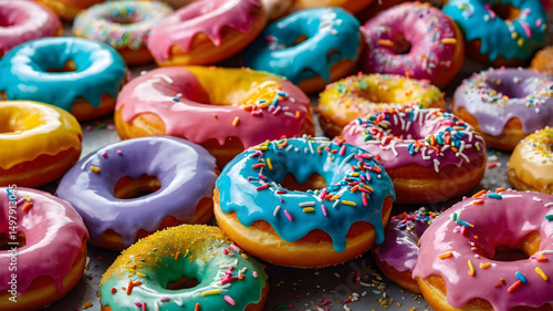 Vibrant Donuts Galore: A Colorful Array with Shiny Glaze and Sprinkles