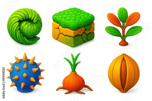 Vibrant Drought-Resistant Icons. 3D icon set of drought-resistant flora: resurrection plant curled, cracked soil moss mat, waxy