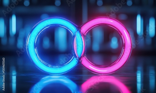 Vibrant dual neon circles interlocked in glowing pink and blue tones, suspended in a dark environment with sharp reflections