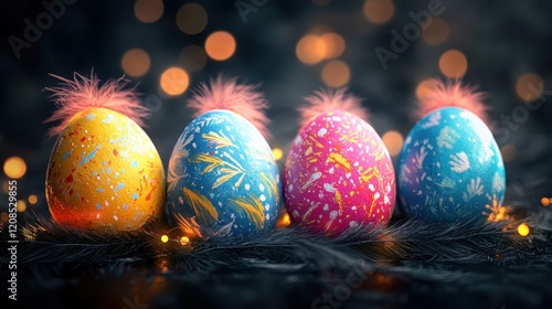 Vibrant easter eggs with feathers amidst glowing lights for seasonal decor