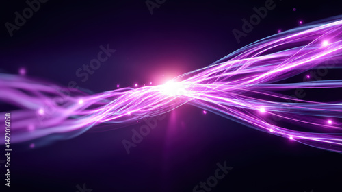 Vibrant electric light streaks of purple energy moving dynamically with glowing particles on dark background, creating futuristic and energetic visual effect