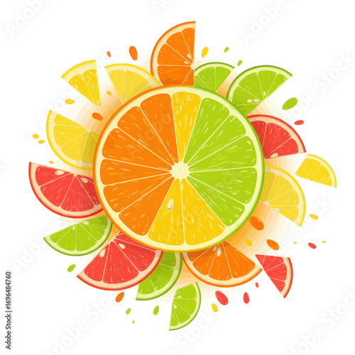 Vibrant explosion of assorted citrus fruit slices on a white background