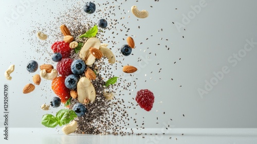 Vibrant Explosion of Fresh Fruits and Nuts on a Light Background