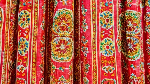 Vibrant fabric with intricate floral patterns in red and yellow hues.