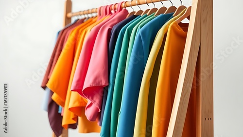 Vibrant fabrics arranged on a wooden rack, illustrating contemporary fashion aesthetics.