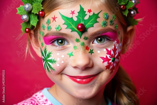 Vibrant festive colors of Christmas face painting design featuring snowflakes, trees, and holly leaves on a bright pink background, perfect for holiday decorations.