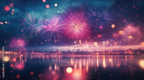 Vibrant fireworks burst over a South Asian coastal town, celebrating with copy space