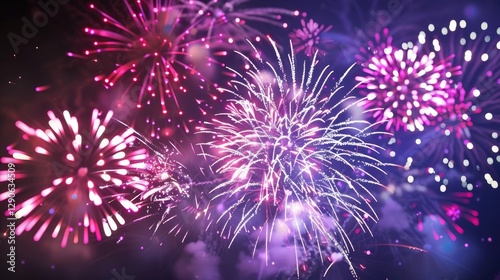 Vibrant fireworks display against dark night sky symbolizing new beginnings, dynamic burst of light captured with wide-angle lens, ample copy space for text or design elements.
