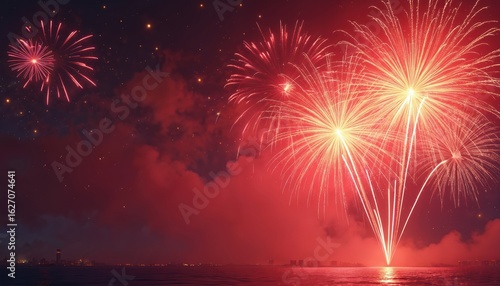 Vibrant fireworks display against dark night sky with red, white explosions. Fireworks scattered, creating stunning visual effect. Grand fireworks spectacle, varying heights, depth, perspective, low