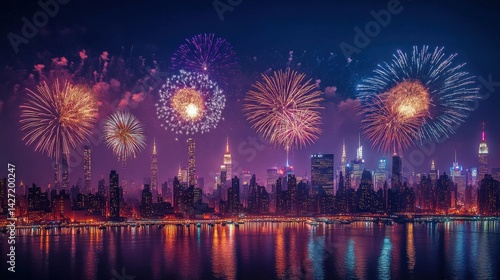 Vibrant fireworks display over the New York City skyline.