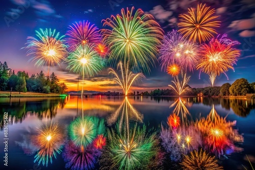 Vibrant fireworks explode above serene lake waters, mirrored reflections of colorful bursts illuminating the night sky, celebrating the festive spirit of Diwali festival.