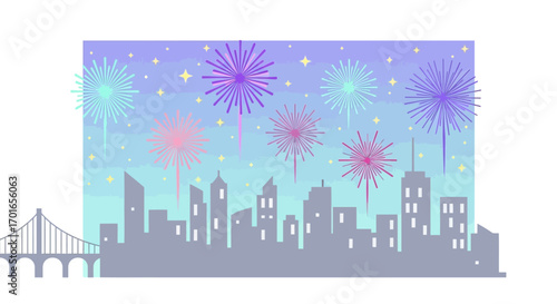 Vibrant fireworks illuminate a city skyline under a starry night sky, celebrating a festive occasion.