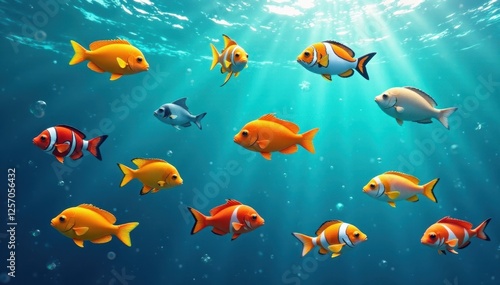 Vibrant fish swim in turquoise ocean waves, seamless repeat , coral, summer, graphics