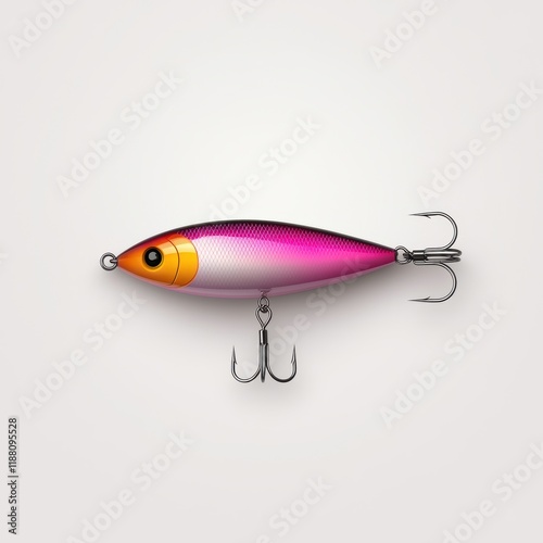 Vibrant fishing lure with pink and orange gradient and sharp hooks on white background