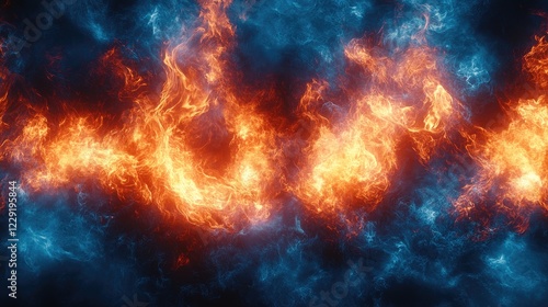 Vibrant flames in shades of orange and blue dance against a dark background, creating a dynamic visual