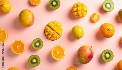 Vibrant Flat Lay of Assorted Tropical Fruits on Light Pink Backdrop Featuring Mangoes Oranges and Kiwis Under Studio Lighting Close Up
