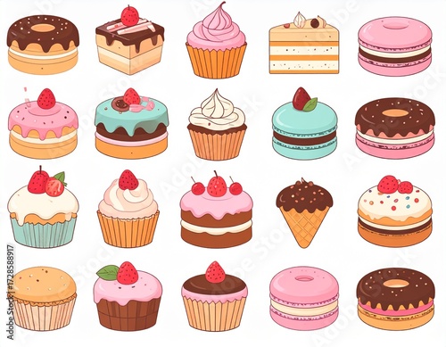 Vibrant flat vector illustration set of delicious sweet treats like cupcakes, donuts, macarons, and slices of cake