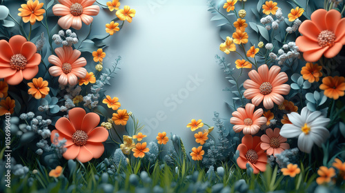 vibrant floral arrangement featuring orange and white flowers, lush greenery, and soft blue background creates cheerful and inviting atmosphere. Perfect for spring themes